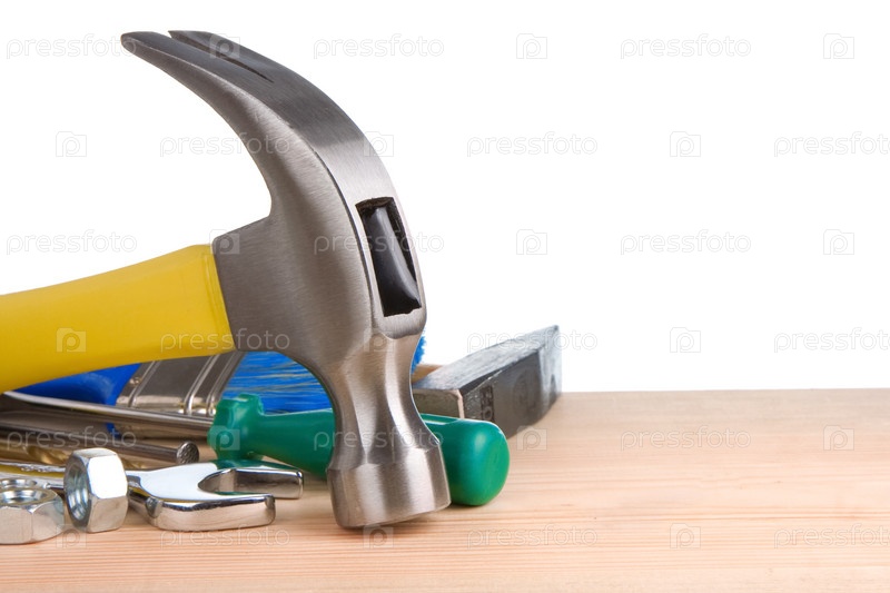 Строительные инструменты на деревянном кирпиче, изолированном на белом