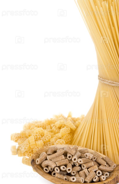 Сырая макароны и деревянная ложка, изолированные на белом
