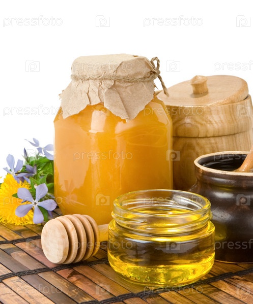 Мед, цветы и банки на белом
