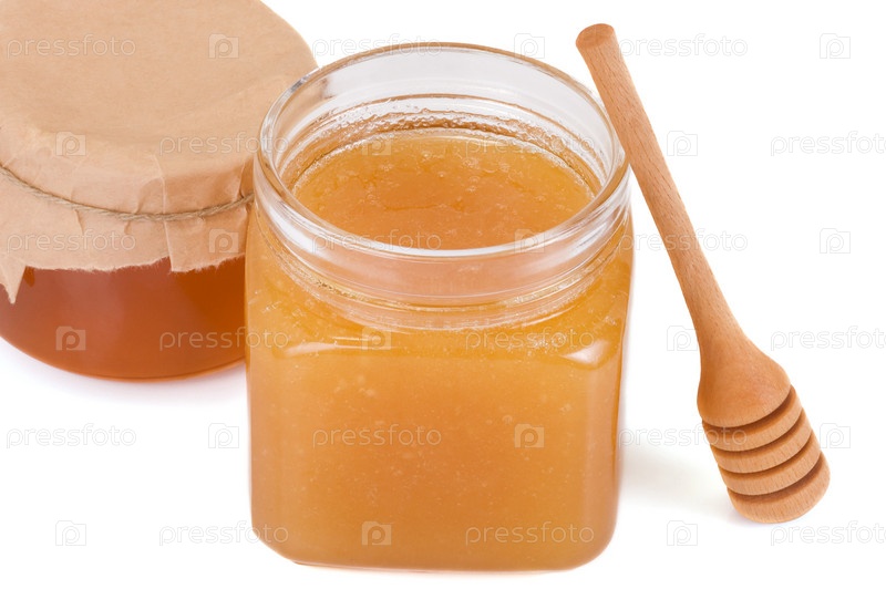 Стеклянные горшки с медом и палкой