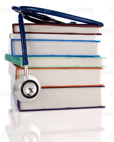 Книги и стетоскоп изолированы на белом