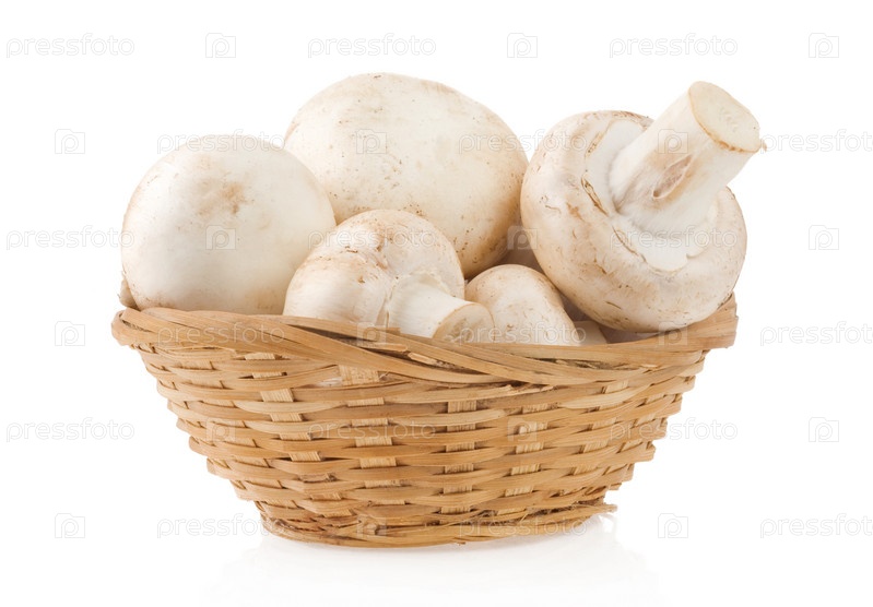 Грибы в виковой корзине, изолированной на белом