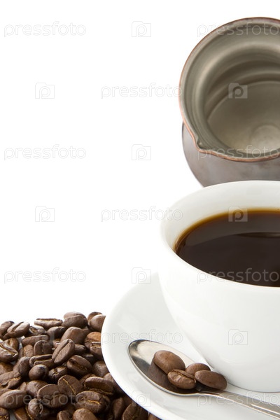 Кофе и горшок с бобами, изолированными на белом