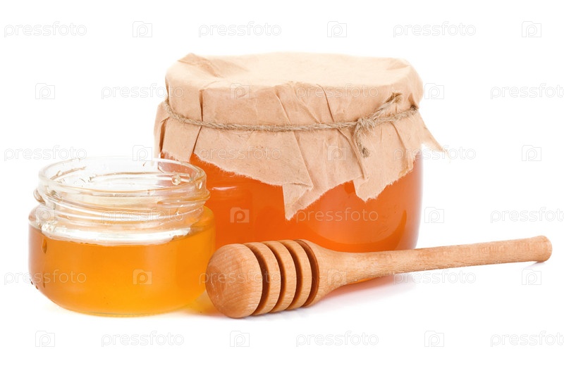 Стеклянный горшок, полный меда изолированного на белом