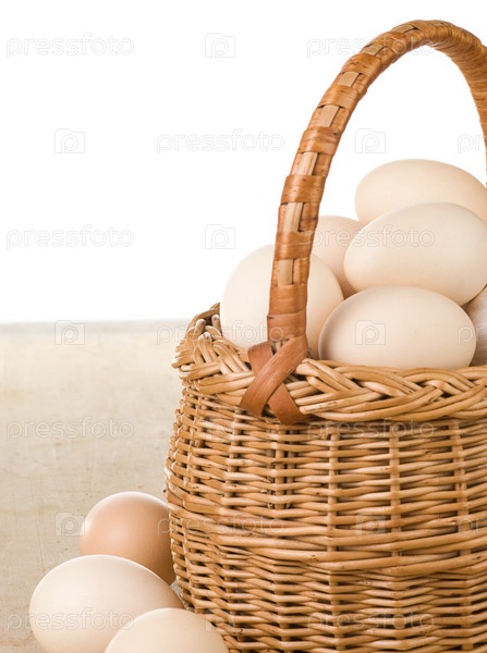 Яйца и корзина изолированы на белом
