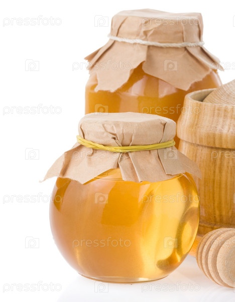 Банка и горшок с медом изолированы на белом