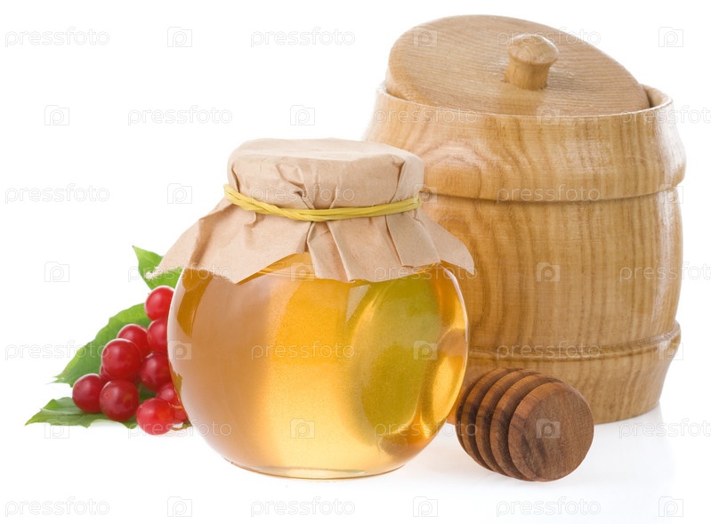 Банка с медом и ягодой, изолированная на белом