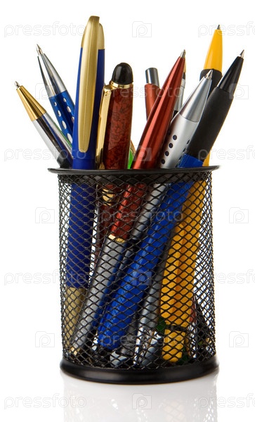 Корзина полная ручек, изолированных на белом