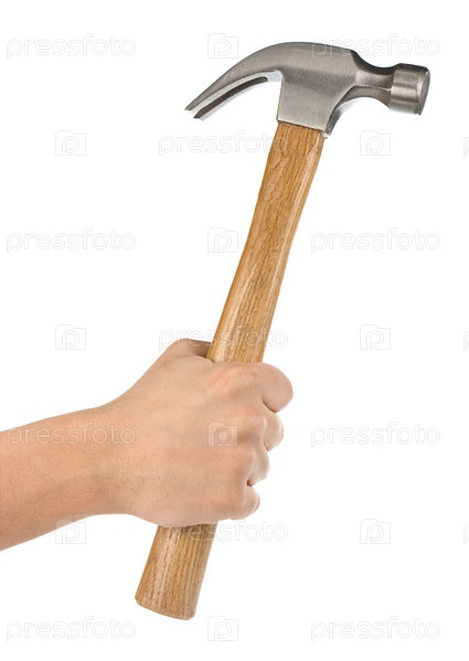 Рука, держащая молот изолированный на белом