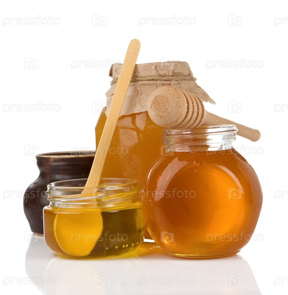Стеклянный горшок, полный меда изолированного на белом