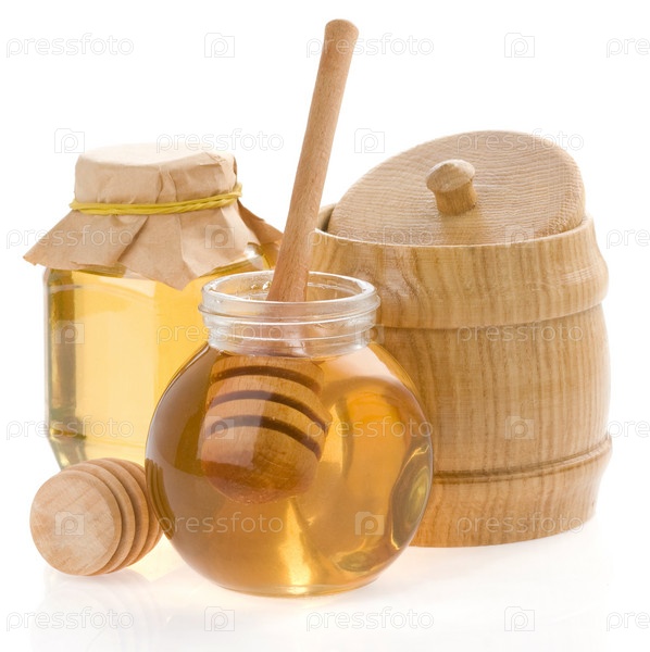 Банка с медом изолирована на белом