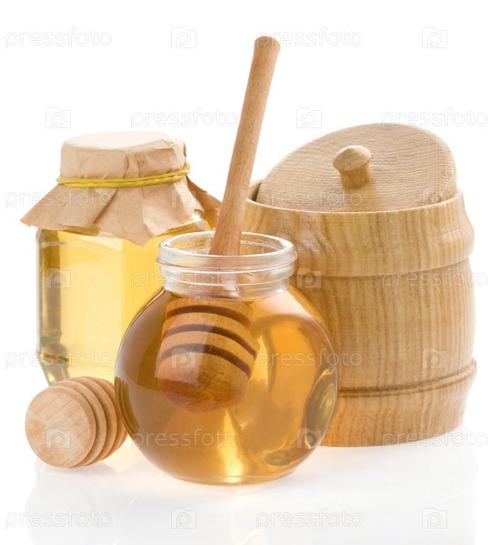 Чайник с медом и деревянной палочкой на белом