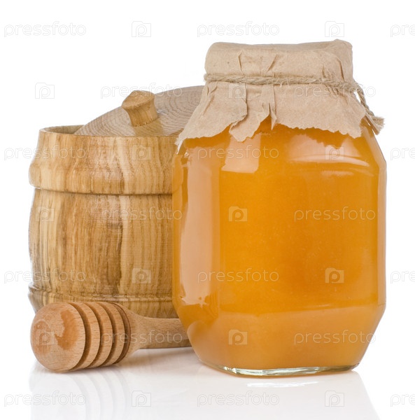 Стеклянные и деревянные банки, полные меда, изолированы на белом