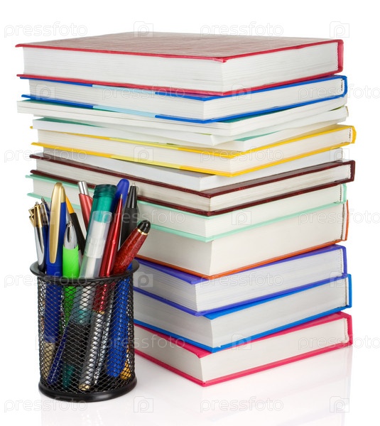 Книги и корзина для держателей с ручками, изолированными на белом