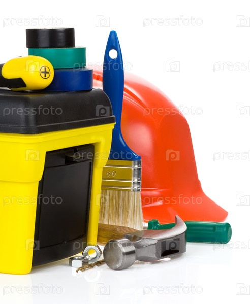 Инструменты и коробка инструментов изолированы на белом