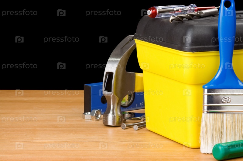 Коробка инструментов и строительные инструменты изолированы на черном
