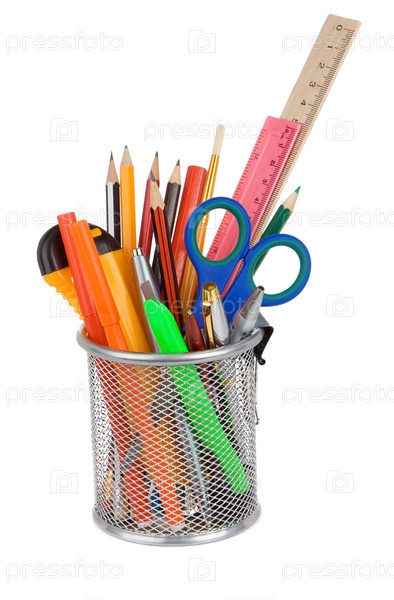 Набор школьных аксессуаров в корзине для держателей на белом