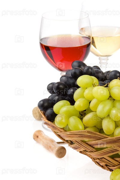 Вино в стакане и виноград, изолированный на белом