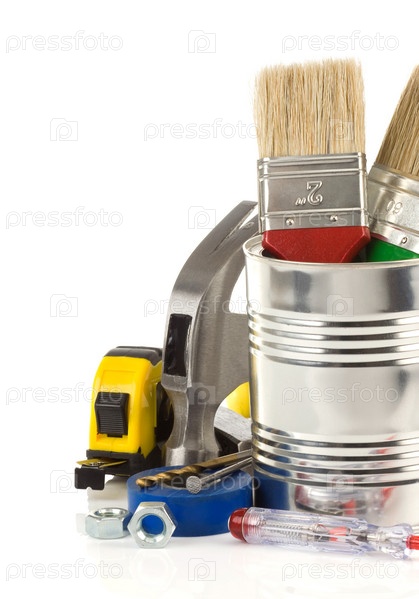 Инструменты и коробка изолированы на белом