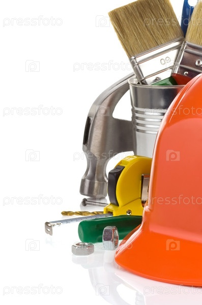 Строительные инструменты и коробка изолированы на белом