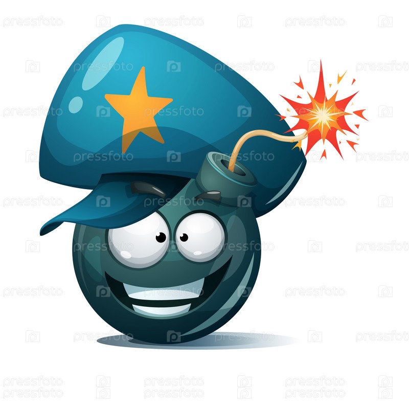 Мультфильм-бомба, предохранитель, фитиль, икона искры. полицейский смайлик