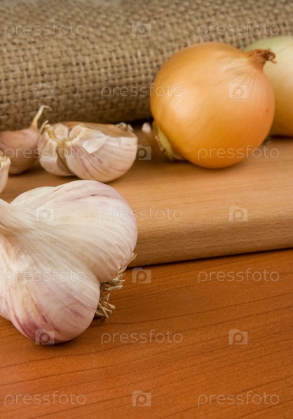 Лук и чеснок на мешке
