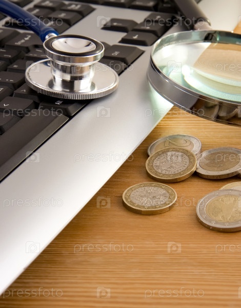 Стетоскоп и лупа на клавиатуре