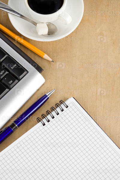 Клавиатура, блокнот и кофе
