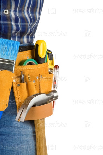 Инструменты и человек с поясом на белом