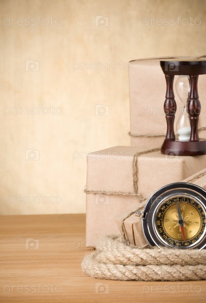 Посылка упакована в коробку и веревку на деревянной доске