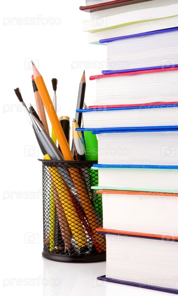 Книги и корзина для держателей с карандашами, изолированными на белом