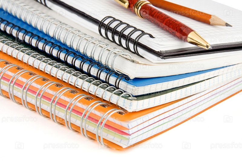 Ручка и карандаш на чекированной тетради изолированы на белом