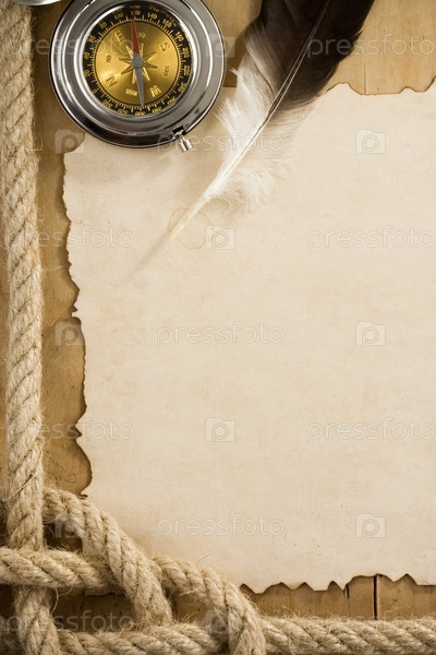 Судовые веревки и компас на пергаментной старой бумаге