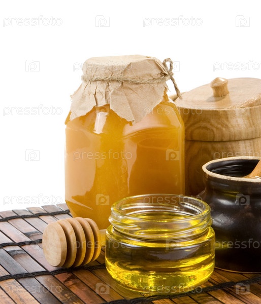 Мед и банки, изолированные на белом