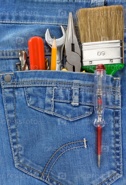 Инструменты в кармане старых синих джинсов