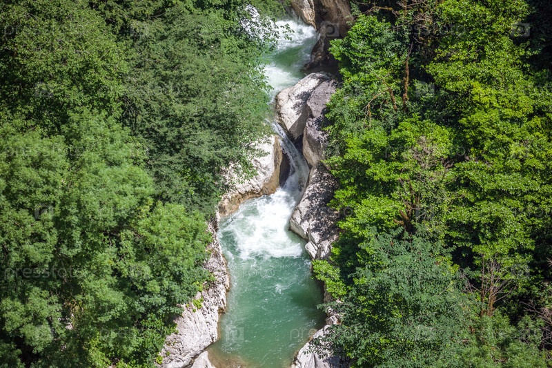 Река, протекающая между двумя высокими скалами с зелеными растениями в Грузии