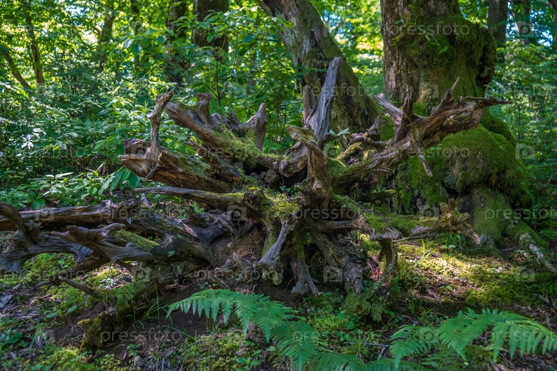 Мох покрывал корни деревьев в лесу, Окаце