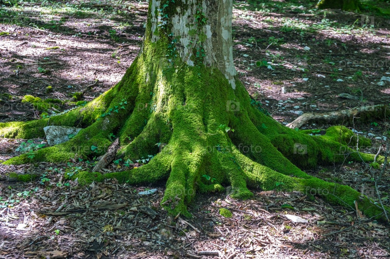 Мох покрывал корни деревьев в лесу, Окаце