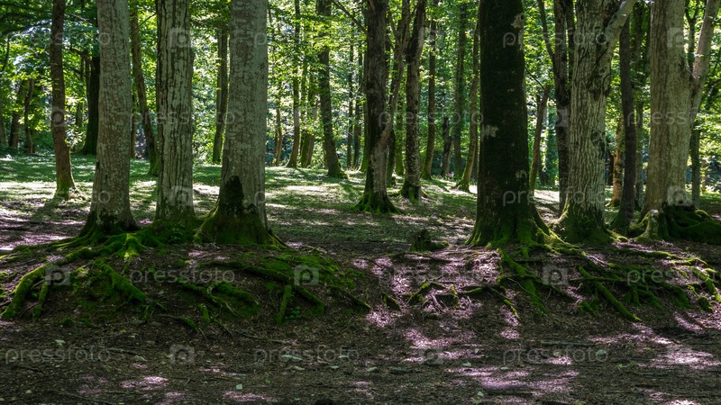Мох покрывал корни деревьев в лесу, Окаце