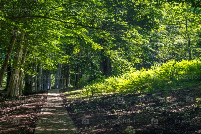 Вид на мощеный лесный путь, ведущий в каньон Okatse