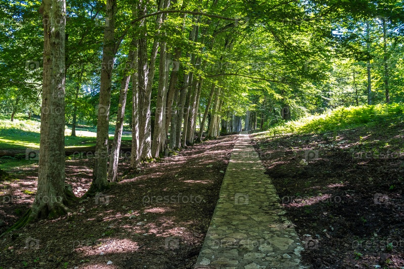 Вид на мощеный лесный путь, ведущий в каньон Okatse