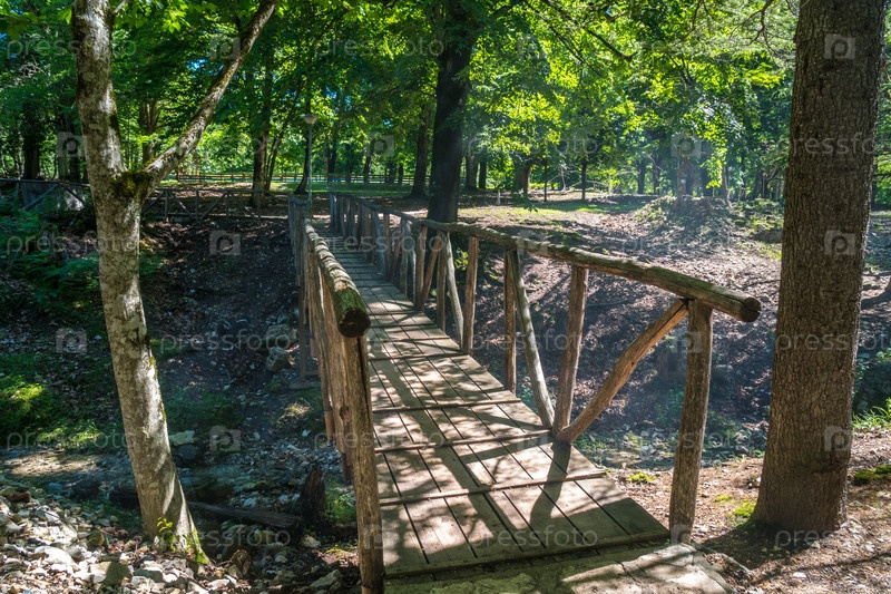 View Of Paved Forest Path и деревянный мост, ведущий в каньон Okatse
