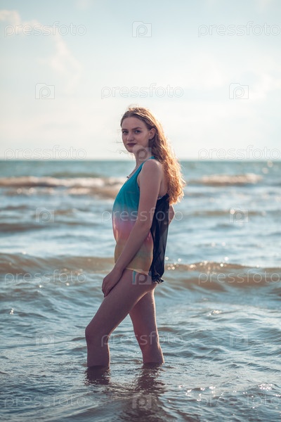 Красивая блондинка в рубашке в море