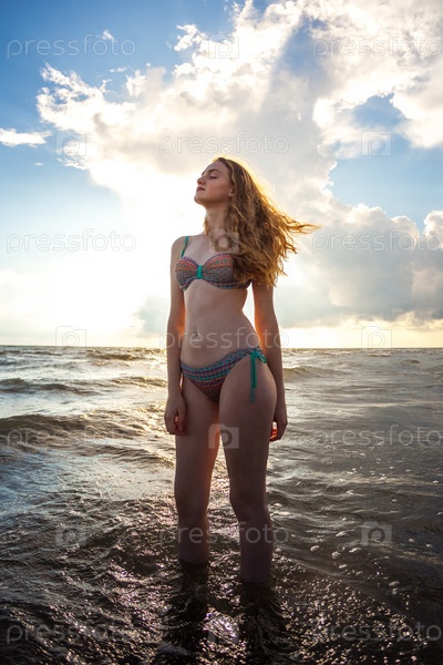 Красивая строительная девушка в море во время захода солнца