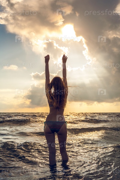 Красивая строительная девушка в море во время захода солнца