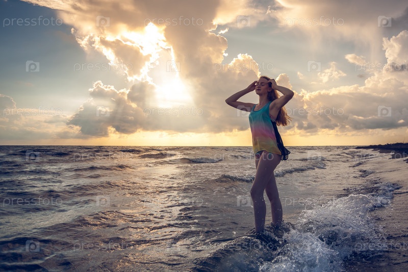 Красивая строительная девушка в море во время захода солнца