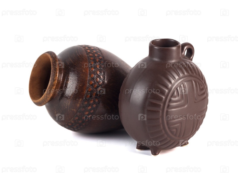 Традиционная грузинская керамическая посуда (чинчила, квеври) для вина на белом фоне