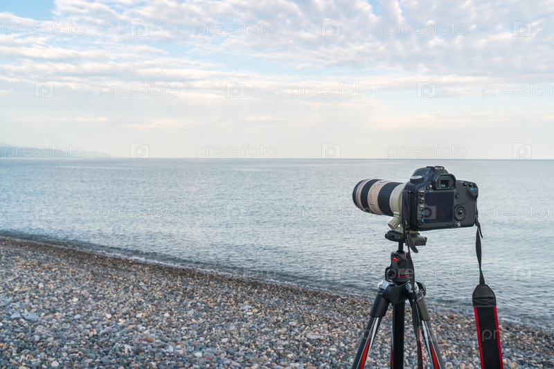 Камера на штативе, каменистый пляж в Квариати, Аджария, Грузия