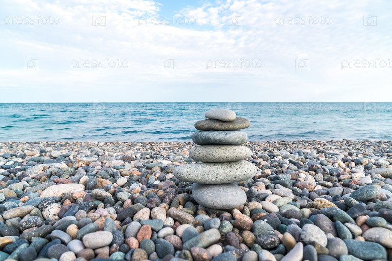 Куча камней на морском пляже, каменный баланс
