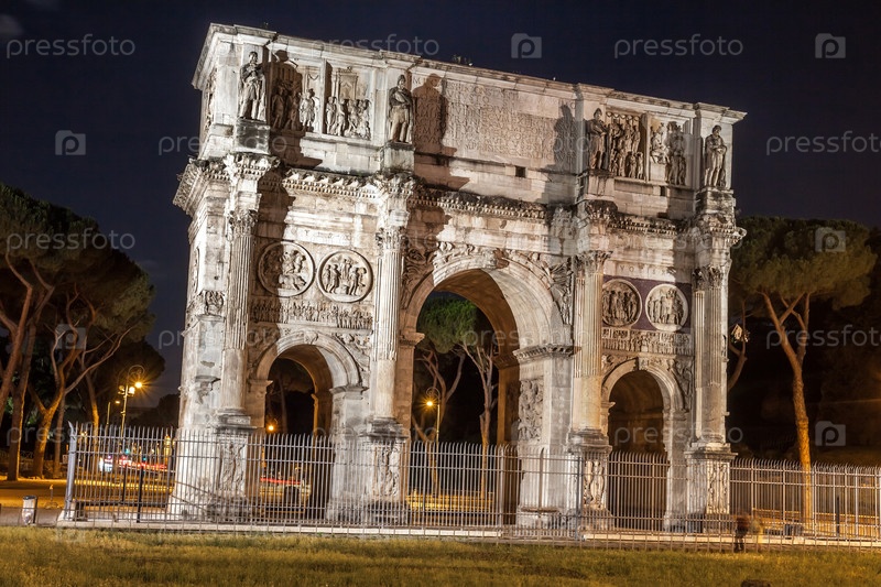 Древняя арка Константина в Риме ночью, Италия